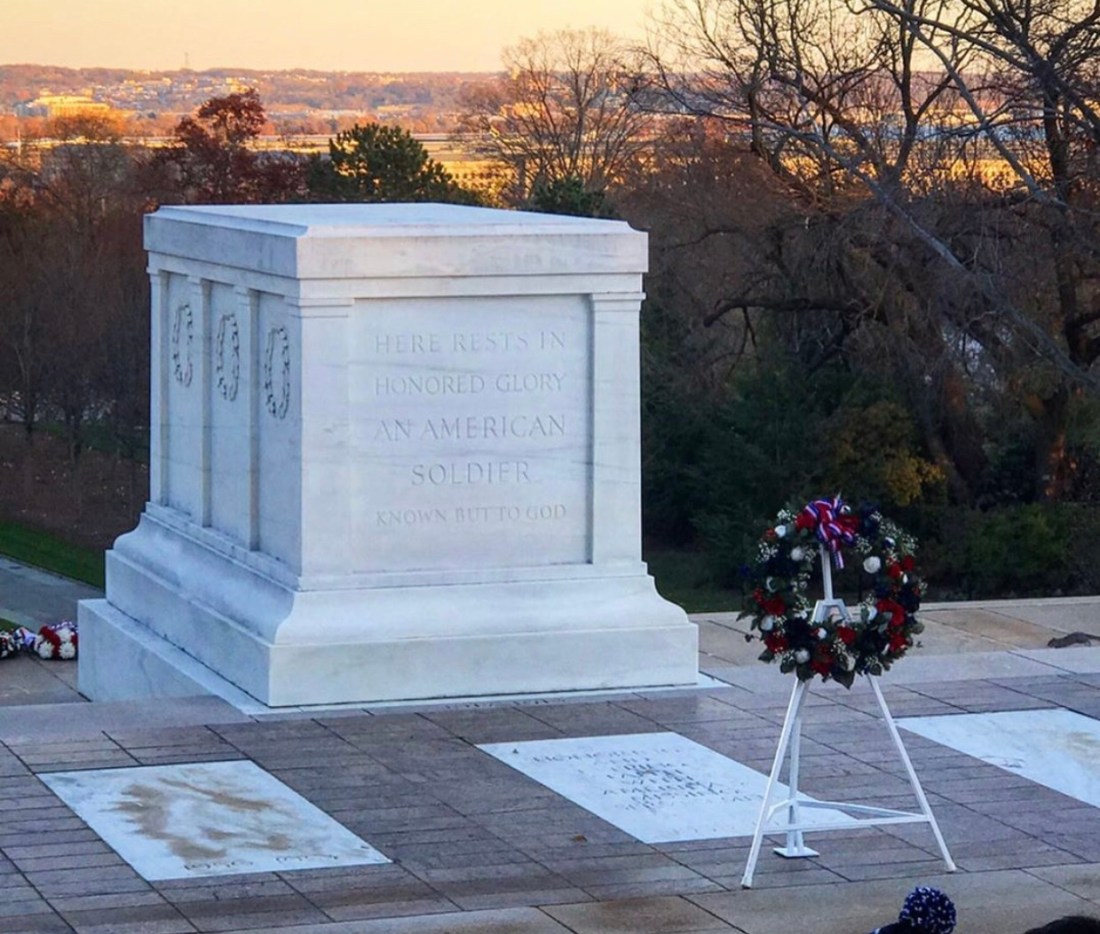 We rang the bell to an inconspicuous door tucked into the side of the white stone walls of the amphitheater. The sputtering sound of the intercom hollowed out the voice of a soldier requesting our purpose. Upon stating our name and intention, he asked if we were dressed appropriately. My Dad stood beside me, his black wool overcoat surrounding a navy suit, stiff white shirt and royal blue tie, fit and tailored to honor himself and the soldier in the grave. A slate felt fedora covered the head of our family who was regretting stiff shoes on cold concrete. He had the distinguished look of a statesman.