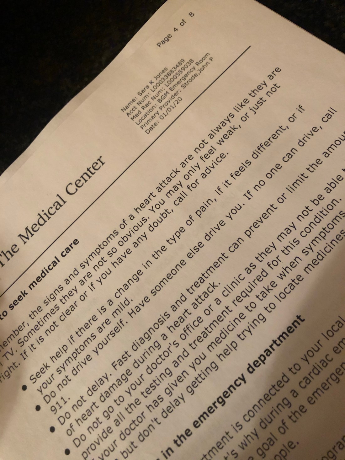“We can admit you so a cardiologist can see you sometime tonight or you can go home and see the cardiologist at 10.” The doctor could find no explanation for what happened. I met none of the risk factors for heart disease. My pulse and blood pressure had remained steady and consistent the entire time I was in care. A cardiologist would likely want to run more tests, but as for what could happen at the ER, they had done all they could do except admit me. I opted, with approval, to go home.